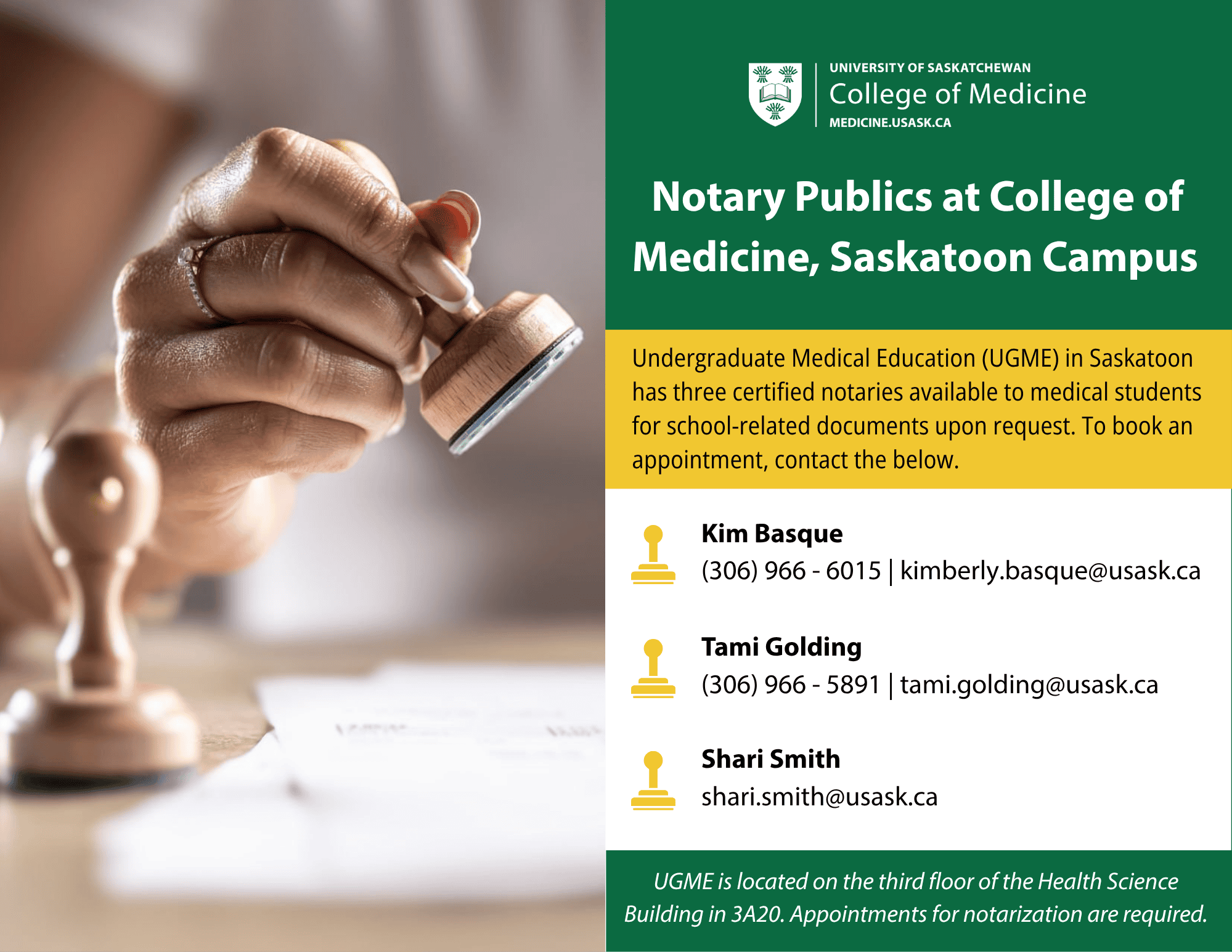 Note: Undergraduate Medical Education (UGME) in Saskatoon has three certified notaries available to medical students for school-related documents upon request. Find their contact information here.