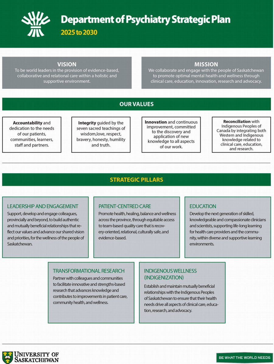 We collaborate and engage with the people of Saskatchewan to promote optimal mental health and wellness through clinical care, education, innovation, research, and advocacy.