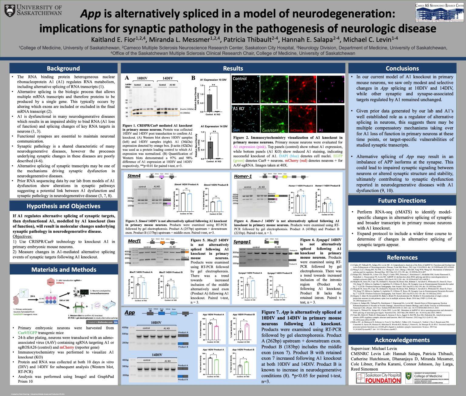 Results: Knockout was confirmed with >97% decrease in A1 expression compared to control neurons (p<0.01, paired t-test). Alternative splicing analysis showed no significant difference of synaptic targets, Stmn4, Homer-1, and Syngap1 following A1 knockout. Importantly, there was a change in App splicing at 10DIV and 14DIV (p<0.05, paired t-test).