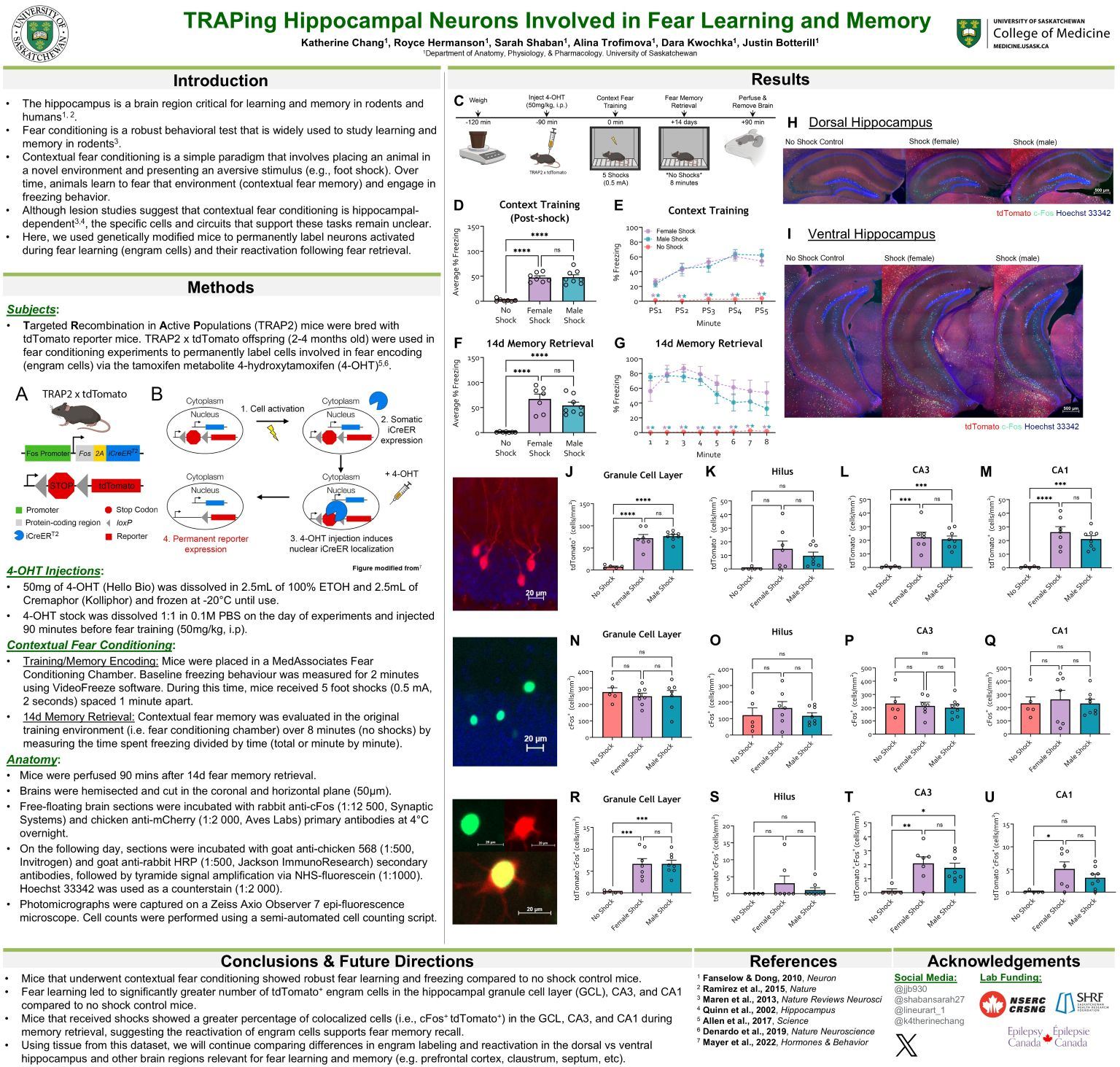 Contextual fear conditioning is used to study learning and memory in rodents. While previous studies suggest that the hippocampus is important for contextual fear memories, the brain circuits involved in encoding and retrieving fear memories are not fully understood. Here, we used TRAP2xtdTomato mice to investigate freezing behaviour and neuron activation after foot shocks. Mice were placed in a fear conditioning chamber and administered foot shocks. 14 days later, mice were placed in the original training environment without foot shocks. Fear memory retrieval was assessed by time spent freezing. Semi-automatic cell counting scripts were used to quantify the cells involved in encoding, retrieval and both timepoints. Foot shocks significantly increased the density of neurons (cells/mm^2) activated during encoding and both timepoints compared to control mice in the granule cell layer, CA3, and CA1. Foot shocks did not significantly increase the density of neurons activated during retrieval compared to control mice. Results suggest the hippocampus is involved in fear memory encoding. Moreover, results suggest the retrieval of encoded fear memories does not increase total neuron activation but rather, a greater proportion of neurons activated during retrieval will be neurons involved in encoding fear memories compared to control mice.