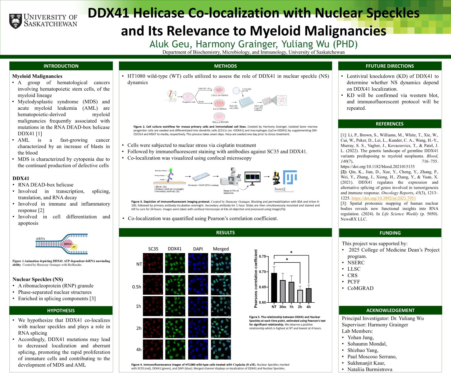 Myelodysplastic Syndrome (MDS) and Acute Myeloid Leukemia (AML) are hematopoietic-derived myeloid malignancies frequently associated with mutations in the RNA DEAD-box helicase DDX41. Previous work in the Wu lab has investigated the molecular pathogenesis of DDX41 mutations by examining cytoplasmic ribonucleoprotein (RNP) granule dynamics, specifically processing bodies (P-bodies, PBs) and stress granules (SGs). Given that DDX41 is primarily localized in the nucleus, we have expanded our investigation of RNP granules to include nuclear speckles (NS), which are phase-separated nuclear structures enriched in splicing components. We hypothesize that DDX41 co-localizes with nuclear speckles and plays a role in RNA splicing. Accordingly, DDX41 mutations may lead to decreased localization and aberrant splicing, promoting the rapid proliferation of immature cells and contributing to the development of MDS and AML. To investigate our hypothesis, we first utilized HT1080 wild-type (WT) cells to assess the role of DDX41 in nuclear speckle (NS) dynamics. Cells were subjected to nuclear stress via cisplatin treatment, followed by immunofluorescent staining with antibodies against SC35 and DDX41. Co-localization was visualized using confocal microscopy and quantified using Pearson’s correlation coefficient. We observed that DDX41 positively correlates with SC35, and its localization to nuclear speckles decreases over the course of stress treatment.