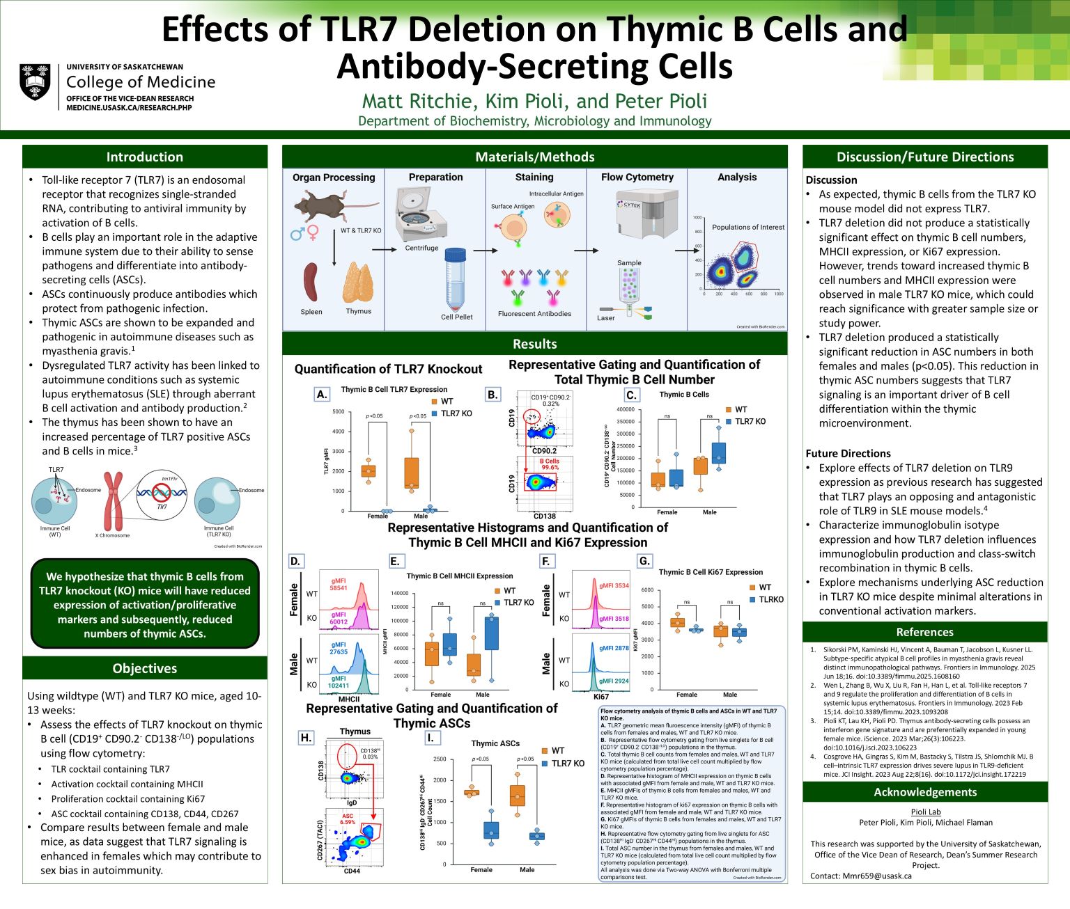 Toll-like receptor 7 (TLR7) is an endosomal RNA-sensing receptor that promotes antiviral immunity through interferon induction as well as B cell activation and differentiation into antibody-secreting cells (ASCs). While protective in infection, dysregulated TLR7 signaling is implicated in autoimmune diseases such as systemic lupus erythematosus, in part by driving aberrant ASC expansion. Thymic ASCs, which are expanded in autoimmune conditions including myasthenia gravis, may represent a pathogenic subset influenced by TLR7 signaling. We used flow cytometry to assess thymic B cell populations (CD19+CD90.2-CD138-/LO ), TLR7 expression, activation status (MHCII), proliferation (Ki67), and ASC numbers (CD138HIIgD-CD267(TACI)+CD44+) in 10–13-weeks-old wildtype and TLR7 knockout (KO) mice. Results were compared between females and males to evaluate potential sex-related differences. As expected, thymic B cells from TLR7 KO mice lacked TLR7 expression. Deletion of TLR7 did not significantly affect thymic B cell numbers or expression of MHCII and Ki67, though male TLR7 KO mice showed trends toward increased B cell numbers and MHCII expression. In contrast, TLR7 KO animals had significantly reduced thymic ASC numbers in both sexes (p<0.05). These data indicate that TLR7 is a critical driver of ASC differentiation within the thymic microenvironment.
