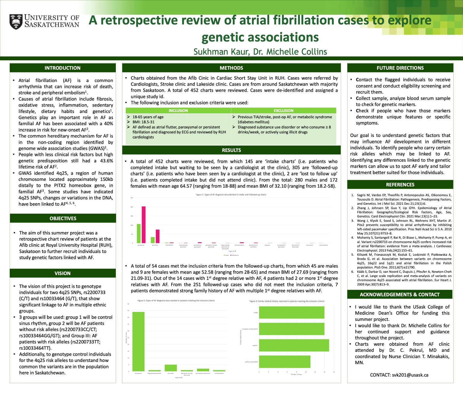Atrial fibrillation (AF) is an arrythmia that can increase risk of certain health outcomes and may have a genetic cause amongst other causes. The project aimed to understand genetic factors that influence AF development in individuals. A retrospective chart review was conducted on 452 charts, that were de-identified, assigned a unique study id and screened through an inclusion and exclusion criteria. 54 eligible cases met the inclusion criteria from which: 45 males and 9 females with mean age 52.58 (ranging from 28-65) and mean BMI of 27.69 (ranging from 21.09-31), including 14 cases with 1st degree relative with AF (from which 4 patients had 2 or more 1st degree relatives with AF). From the cases who did not meet the inclusion criteria, 7 patients demonstrated strong family history of AF with multiple 1st degree relatives with AF. Types of AF documented in the cases were also identified. The future direction is to contact, consent and recruit individuals to collect blood serum samples to identify genetic markers. The vision is to be able to identify people who carry certain risk alleles that may be linked to AF which can help identify AF early and tailor treatment better suited for those individuals.