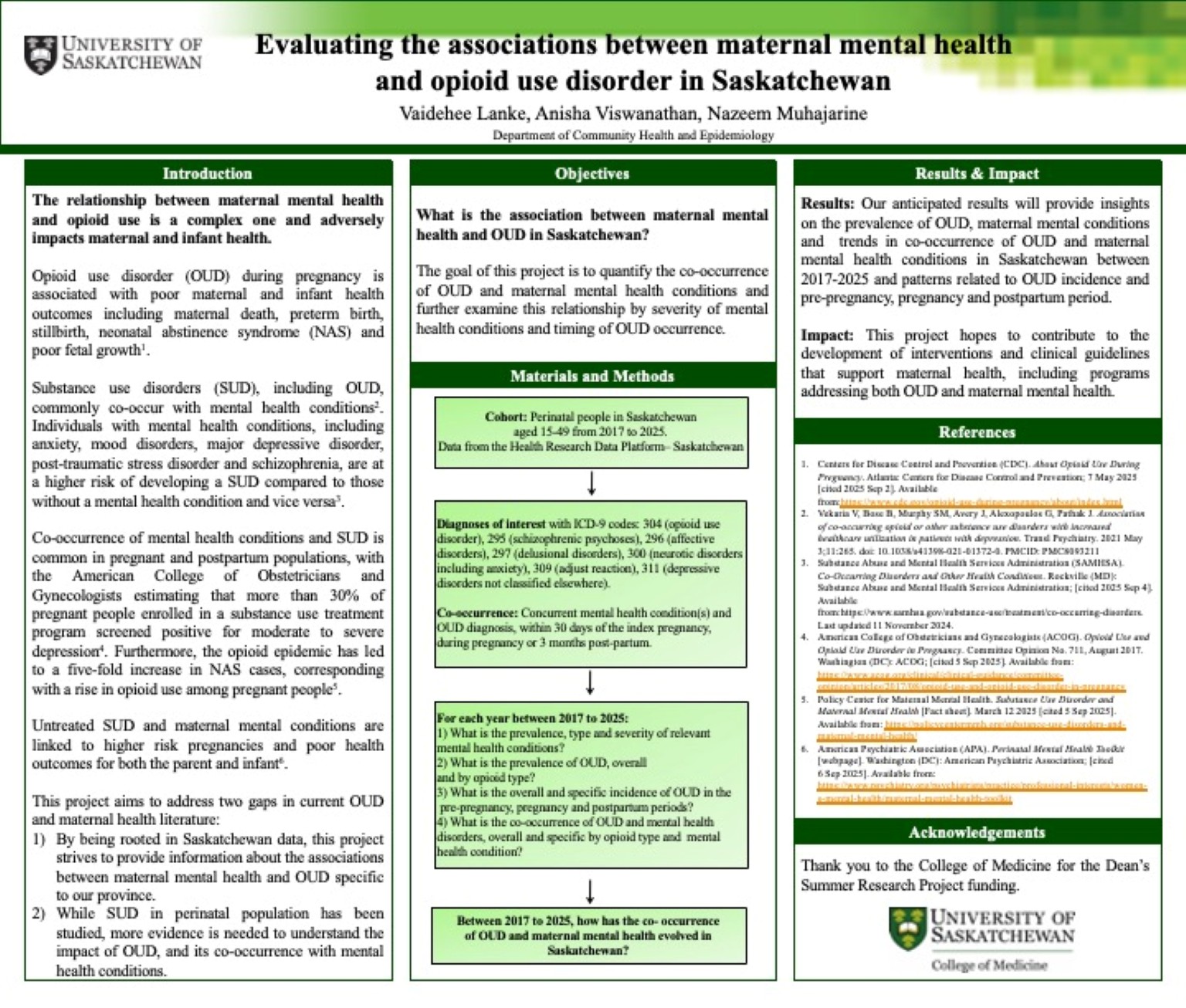 The relationship between maternal mental health and opioid use is a complex one and adversely impacts maternal and infant health. Opioid use disorder (OUD) during pregnancy is associated with poor maternal and infant health outcomes including maternal death, preterm birth, stillbirth, neonatal abstinence syndrome and poor fetal growth. Substance use disorders (SUD), including OUD, commonly co-occur with mental health conditions. Individuals with mental health conditions, including anxiety, mood disorders, major depressive disorder, post-traumatic stress disorder and schizophrenia, are at a higher risk of developing a SUD compared to those without a mental health condition and vice versa. Untreated SUD and maternal mental conditions are linked to higher risk pregnancies and poor health outcomes for both the parent and infant. This project aims to understand and quantify the relationship between maternal mental health and OUD in Saskatchewan between 2017 – 2025, including the point prevalence, incidence and evolution of co-occurrence of OUD and mental health conditions in the perinatal population. Our project hopes to contribute to the development of interventions and clinical guidelines that support maternal health, including programs addressing both OUD maternal mental health.