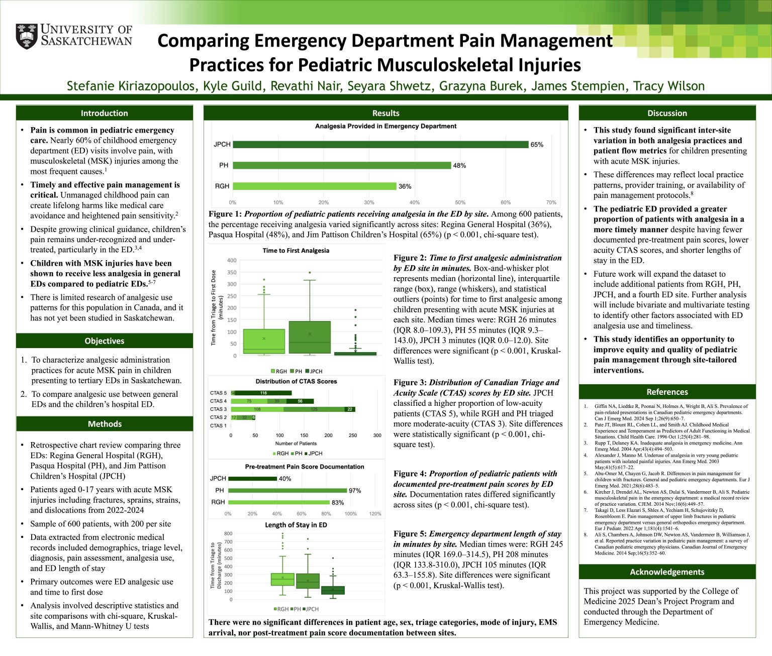 All patients aged 0-17 with acute MSK injuries between 2022 and 2024 at the Regina General Hospital (RGH), Pasqua Hospital (PH), and Jim Pattison Children’s Hospital (JPCH) were identified. Chart reviews were conducted and demographics, triage, diagnosis, pain assessment, and analgesia were collected. Primary outcomes included ED analgesic use and time to first dose. Site comparisons used chi-square and Kruskal-Wallis tests.
