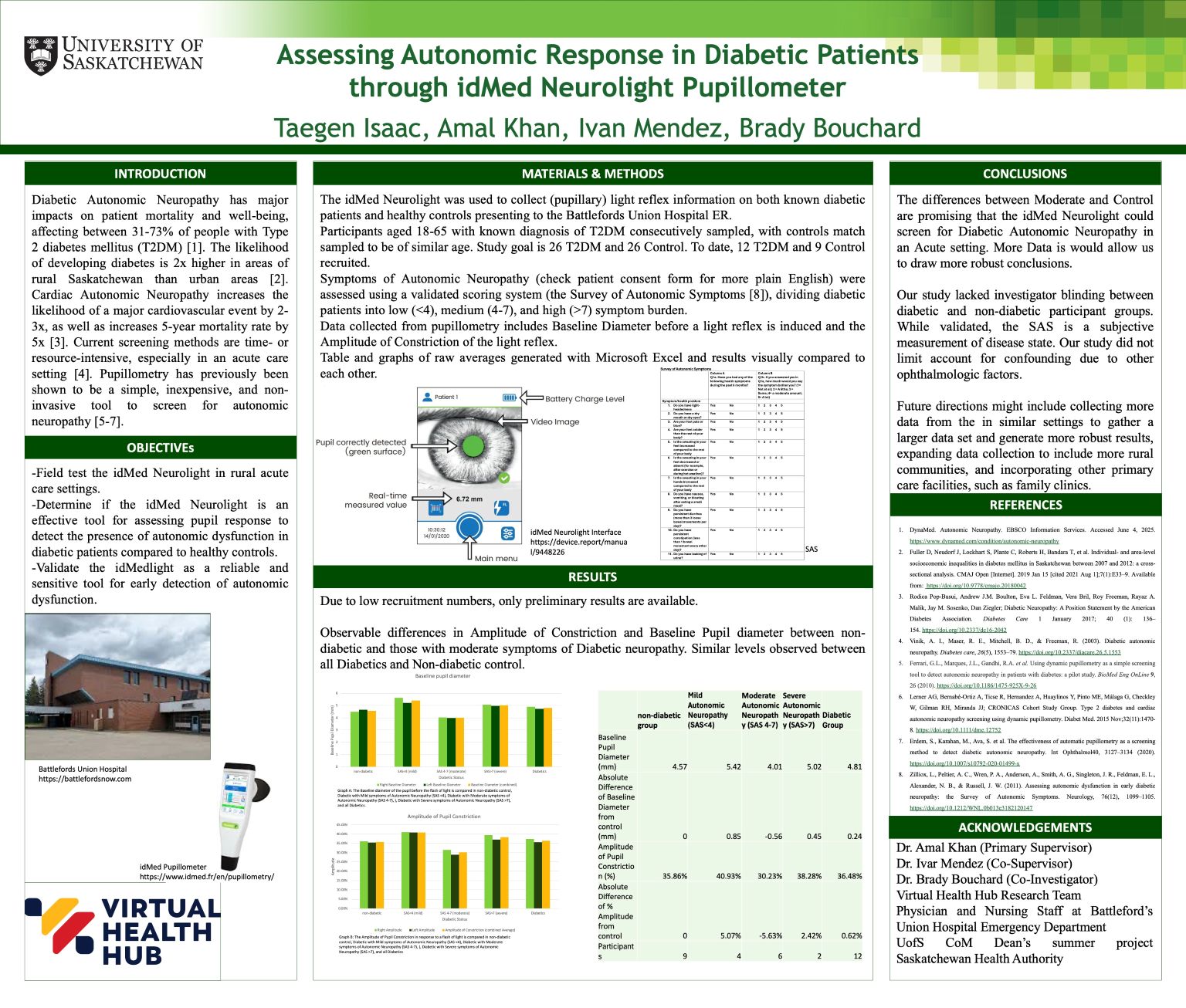 Methods: The idMed Neurolight was used to collect light reflex information on both known diabetic patients and healthy controls presenting to the Battlefords Union Hospital ER. Symptoms of Autonomic Neuropathy were assessed using the Survey of Autonomic Symptoms, dividing diabetic patients into low, medium, and high symptom burden. Baseline Pupil