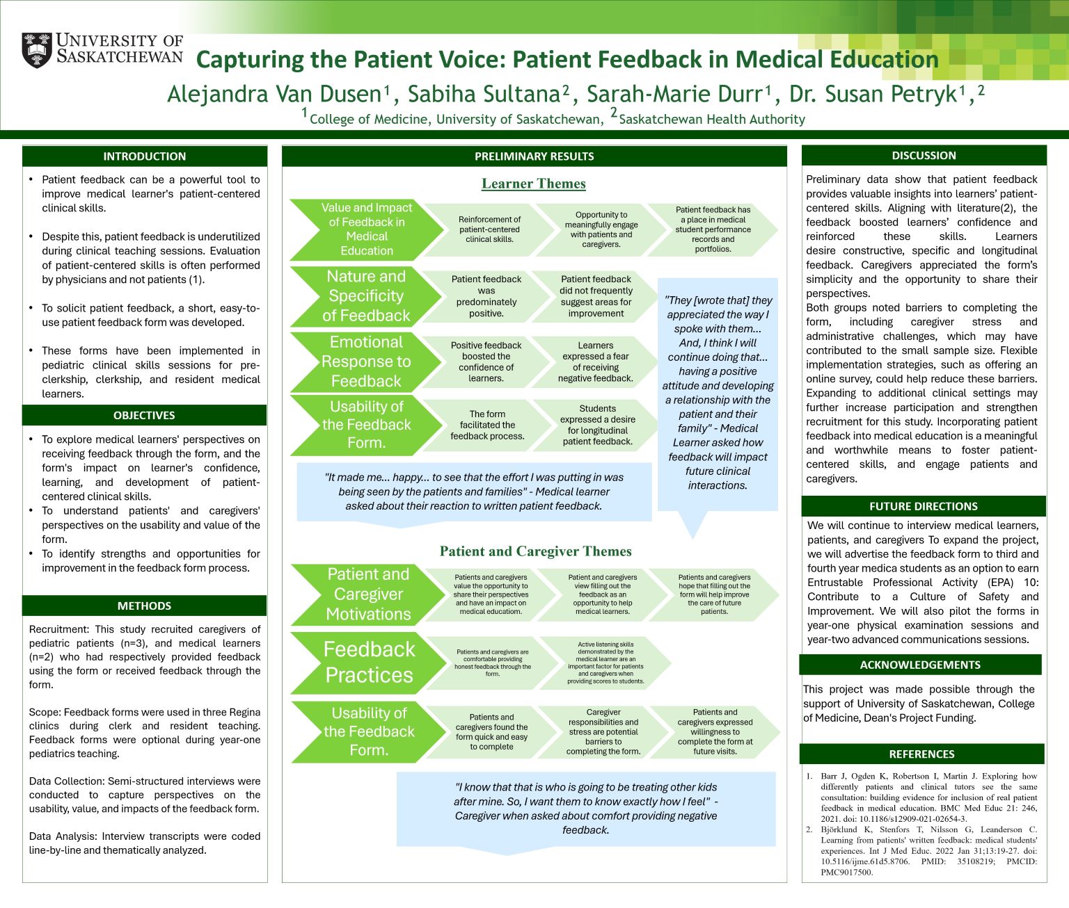 Participants included pediatric caregivers (n=3) and medical learners (n=2). Semi-structured interviews were transcribed and thematically analyzed. Preliminary findings suggest that patient feedback enhanced learners’ confidence and reinforced patient-centered behaviors. Learners expressed interest in longitudinal, constructive feedback to support development. Caregivers reported the form was quick and easy to use, valued the opportunity to contribute to learner growth, and felt comfortable providing both positive and constructive feedback, though some noted barriers related to caregiving demands.