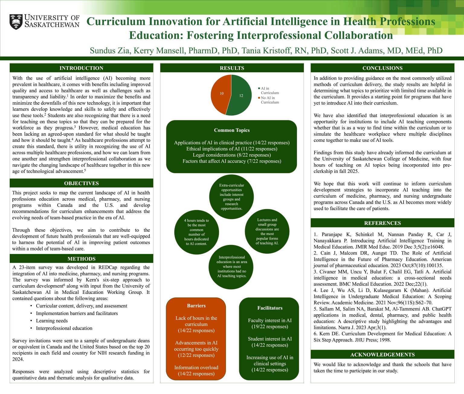 Methods: A survey was developed regarding the integration of AI into medicine, pharmacy, and nursing programs. The survey was informed by Kern's six-step approach to curriculum development. Survey invitations were sent to a sample of undergraduate deans or equivalent in Canada and the United States. Responses were analyzed using descriptive statistics for quantitative data and thematic analysis for qualitative data.
