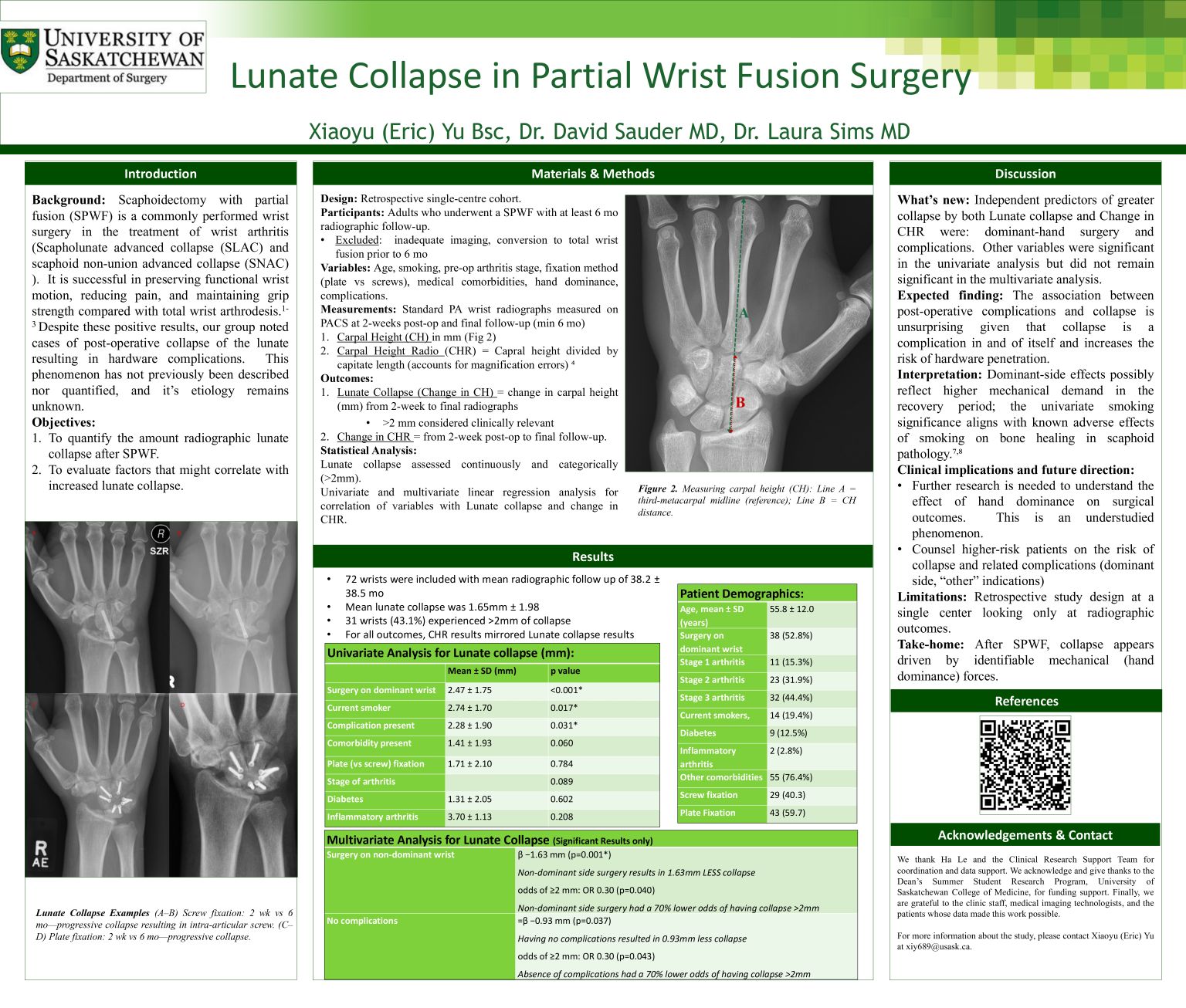 Methods: Retrospective single-centre cohort of adults undergoing SPWF. Immediate postoperative and final PA radiographs were measured for carpal height (mm) and carpal height ratio (CHR). Primary outcome: change in carpal height; clinically significant collapse: ≥2 mm. Univariate and multivariate analyses evaluated associated patient, disease, and surgical factors.