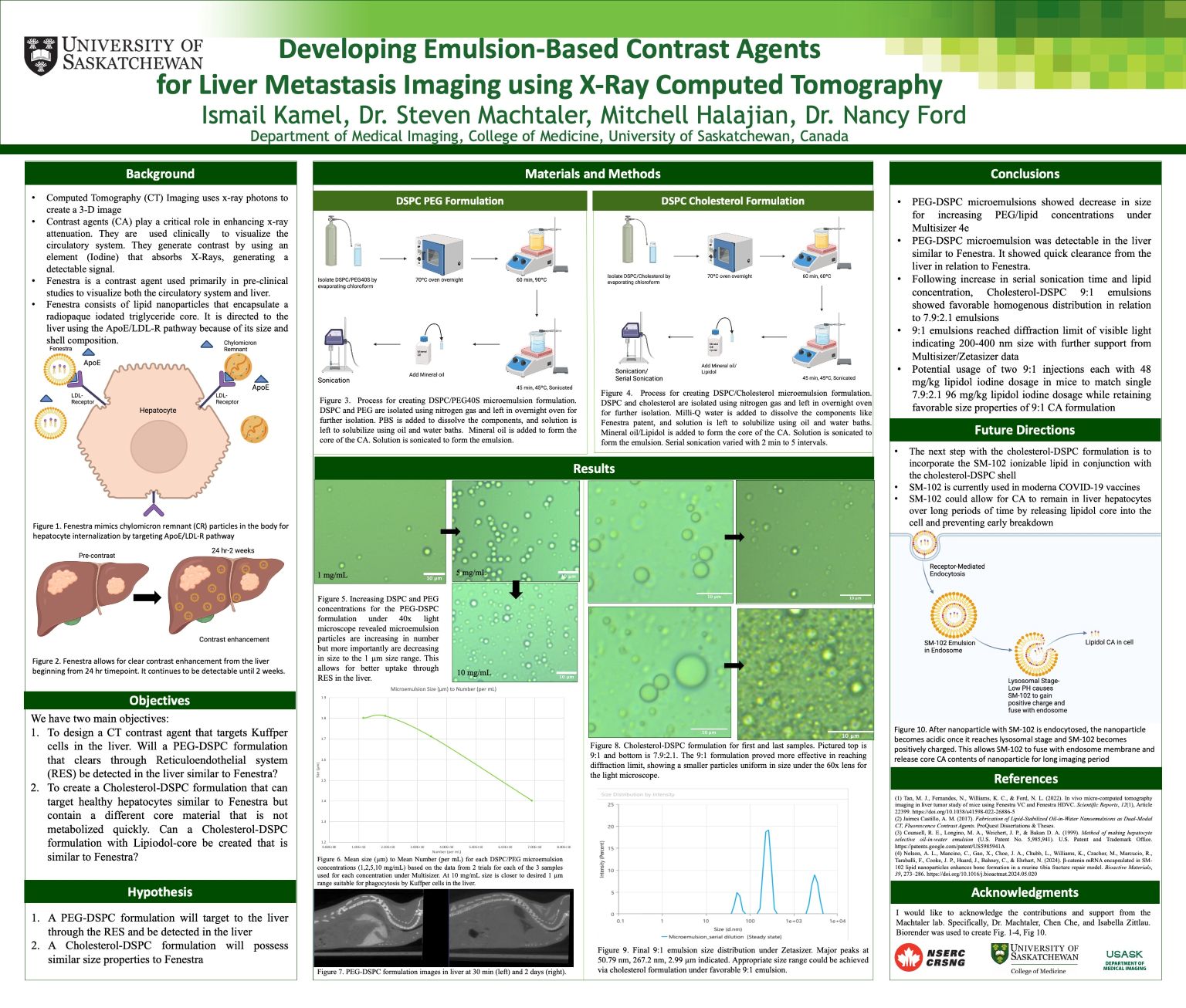 Contrast agents play a critical role in enhancing x-ray attenuation under Computed Tomography (CT) Imaging and are used clinically to visualize the circulatory system. They generate contrast by using radiopaque elements (iodine) that absorb X-Rays which generates a detectable signal. Fenestra is a contrast agent used primarily in pre-clinical studies to visualize both the circulatory system and liver. Fenestra is directed to the liver using the ApoE/LDL-R pathway because of its size and shell composition. In this project, two different formulations were created for potential liver metastasis identification using CT imaging. DSPC-PEG formulations were created for targeting Kuffper cells to clear through the Reticuloendothelial system (RES) and was tested for liver detection. Lipidol-core based DSPC-Cholesterol formulations were tested to see if they could possess similar size properties to fenestra, allowing for similar methods of clearance. Increasing concentrations in DSPC-PEG revealed decreasing emulsion sizes to optimal 1 µm size range. In DSPC-Cholesterol, increasing lipid concentrations along with serial sonication in 9:1 lipid to Lipidol emulsions presented favorable 200-400 nm size distribution. Emulsion size analysis was supported by Multisizer/Zetasizer data and microscope scans. To allow for long-term contrast imaging in DSPC-Cholesterol formulations, further studies may incorporate SM-102 ionizable lipid into emulsion shell.