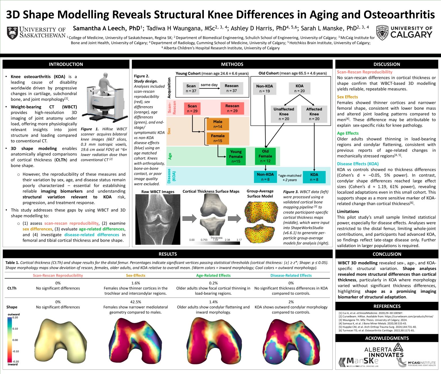 Methods: Cortical thickness maps, generated with a validated cortical bone mapping pipeline, were aligned to WBCT surface masks and loaded into ShapeWorks for statistical shape modelling and cortical thickness network analyses. Analyses assessed scan-rescan reproducibility in young adults (n=29), sex differences (15 females, 14 males), age effects (15 young adults vs 19 older females), and disease effects (KOA n=8 vs age-matched controls n=8). Knees with arthroplasty, bone-on-bone contact, or poor image quality were excluded.