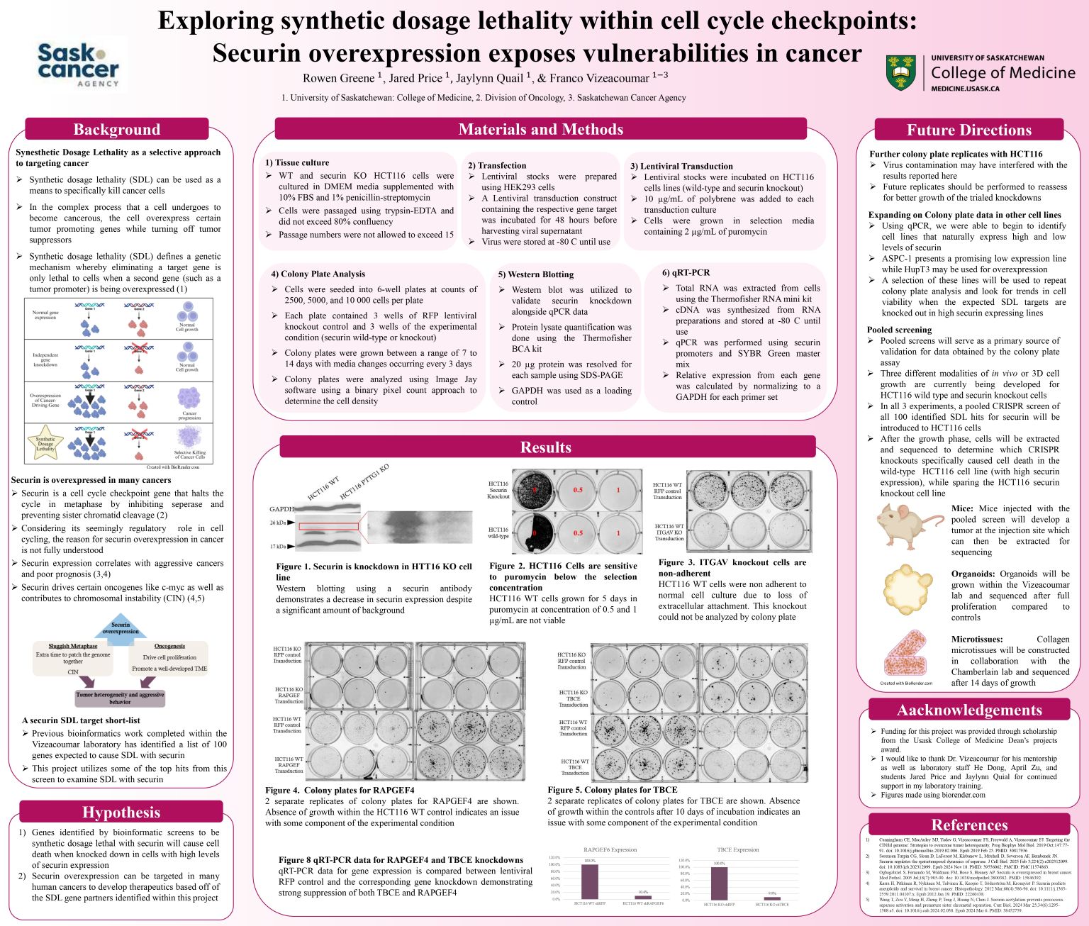 Synthetic dosage lethality (SDL) presents a targeted means by which cells overexpressing a specific gene can be specifically targeted in cancer treatment. Securin is an important regulator of the metaphase-anaphase checkpoint within regular cell cycling that is commonly upregulated across many cancers, making it a strong target for SDL screening. This project was directed by previous bioinformatic screening done within the Vizeacoumar laboratory that identified a list of 100 securin SDL hits. Over the course of this project, a series of confirmatory colony formation assays were performed to validate these computationally predicted gene hits. The sequence of the project involved producing lentiviral vectors carrying shRNA for a gene of interest, transduction of HCT116 cells wild type and knockout securin, and analysis of the growth of each cell condition. Although poor transduction results limited the amount of data produced, future sequencing of pooled screening data will help to validate the predicted SDL interactions examined within this project.