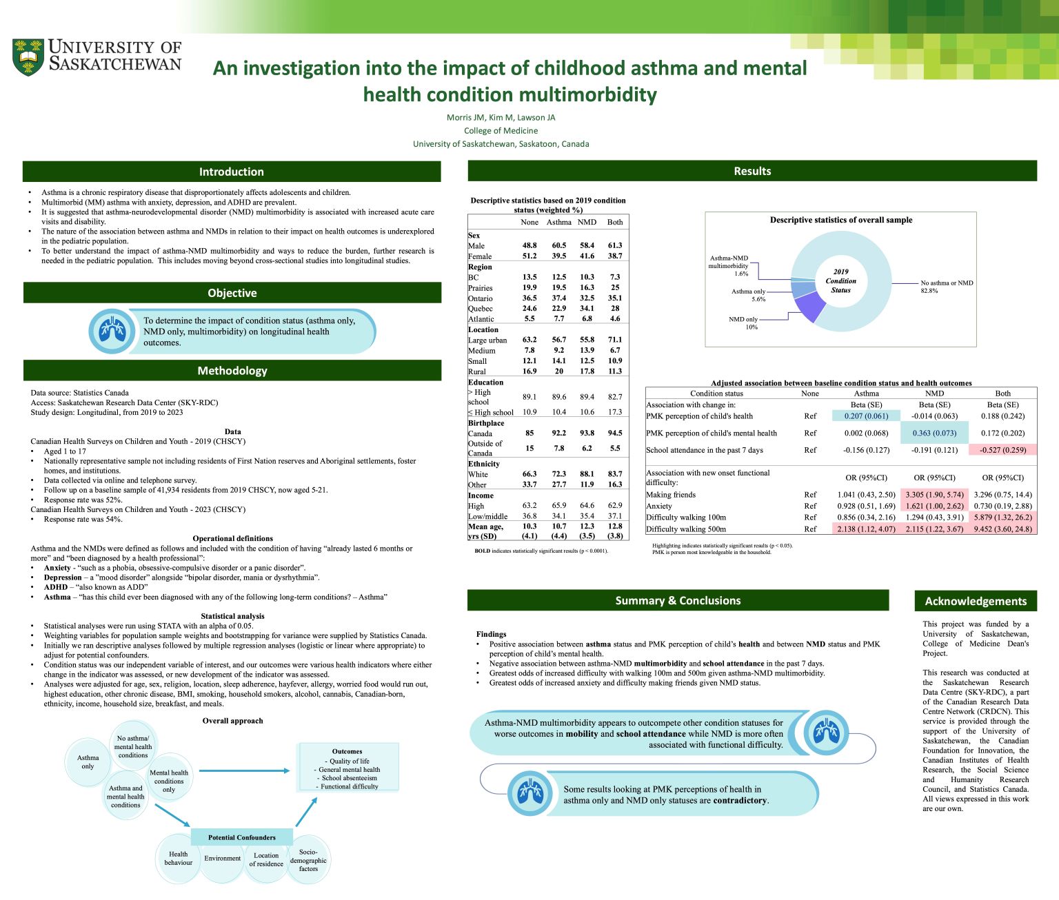 Results: Results suggested a positive association between asthma status and the person-most-knowledgeable (PMK’s) perception of the child’s health (β=0.27) but increased risk of difficulty walking 500m (OR=2.14, 95%CI=1.12, 4.07). NMD status was positively associated (β=0.363) with PMK perception of child’s mental health but with an increased risk of difficulty making friends (OR=3.31, 95%CI=1.90, 5.74), difficulties due to anxiety (OR=1.62, 95%CI=1.00, 2.62), and difficulty walking 500m (OR=2.12, 95%CI=1.22,3.67). Asthma-NMD multimorbidity was negatively associated with school attendance (β=-0.527) and showed an increased risk of difficulty walking 100m (OR=5.79, 95%CI=1.32, 26.2) and 500m (OR=9.45, 95%CI=3.60,24.8).