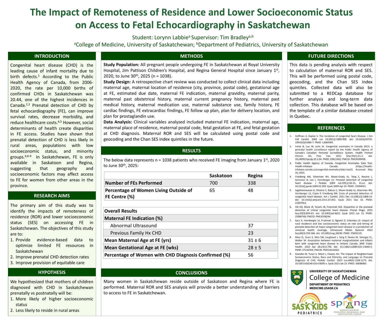 Background: Congenital heart disease (CHD) is the leading cause of infant mortality due to birth defects. Prenatal diagnosis by fetal echocardiography (FE), can improve survival rates, decrease morbidity, and reduce healthcare costs. The aim of this study was to identify the impact of remoteness of residence (ROR) and lower socioeconomic status (SES) on access to FE in Saskatchewan.