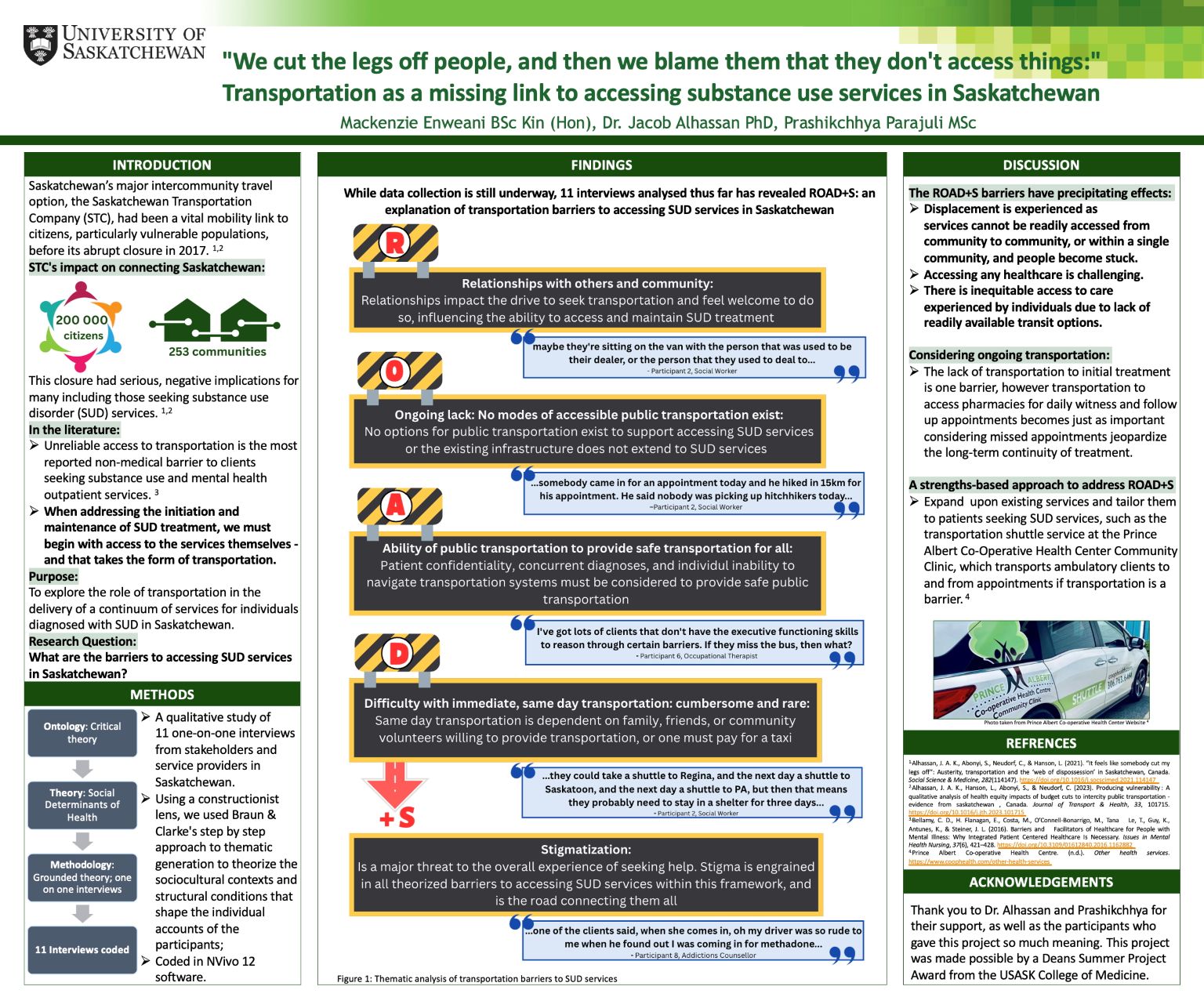 Saskatchewan’s major intercommunity travel option, the Saskatchewan Transportation Company (STC), had been a vital mobility link to over 200,000 citizens every year before its abrupt closure in 2017. Comprised of 41 buses connecting 253 communities, this closure had serious implications for those in Saskatchewan who are unable to transport themselves. Unreliable access to transportation has been cited as the most commonly documented / reported non-medical barrier to clients seeking substance use disorder (SUD) and mental health outpatient services - reinforcing our concern for a lack of a transportation system.3 This qualitative study interviewed 11 service providers and stakeholders, where five major transportation barriers to accessing SUD treatment in Saskatchewan were identified and expressed as ROAD+S: Relationships with others and the community, Ongoing lack of accessible public transportation, Ability of public transportation to provide safe transportation for all, Difficulty with immediate same day transportation, and Stigmatization. These barriers scratch the surface of issues surrounding transportation and its role in accessible SUD care. Expanding upon existing services but tailoring them to better support those seeking SUD treatment is a strengths-based way to begin to improve transportation options for patients in Saskatchewan.