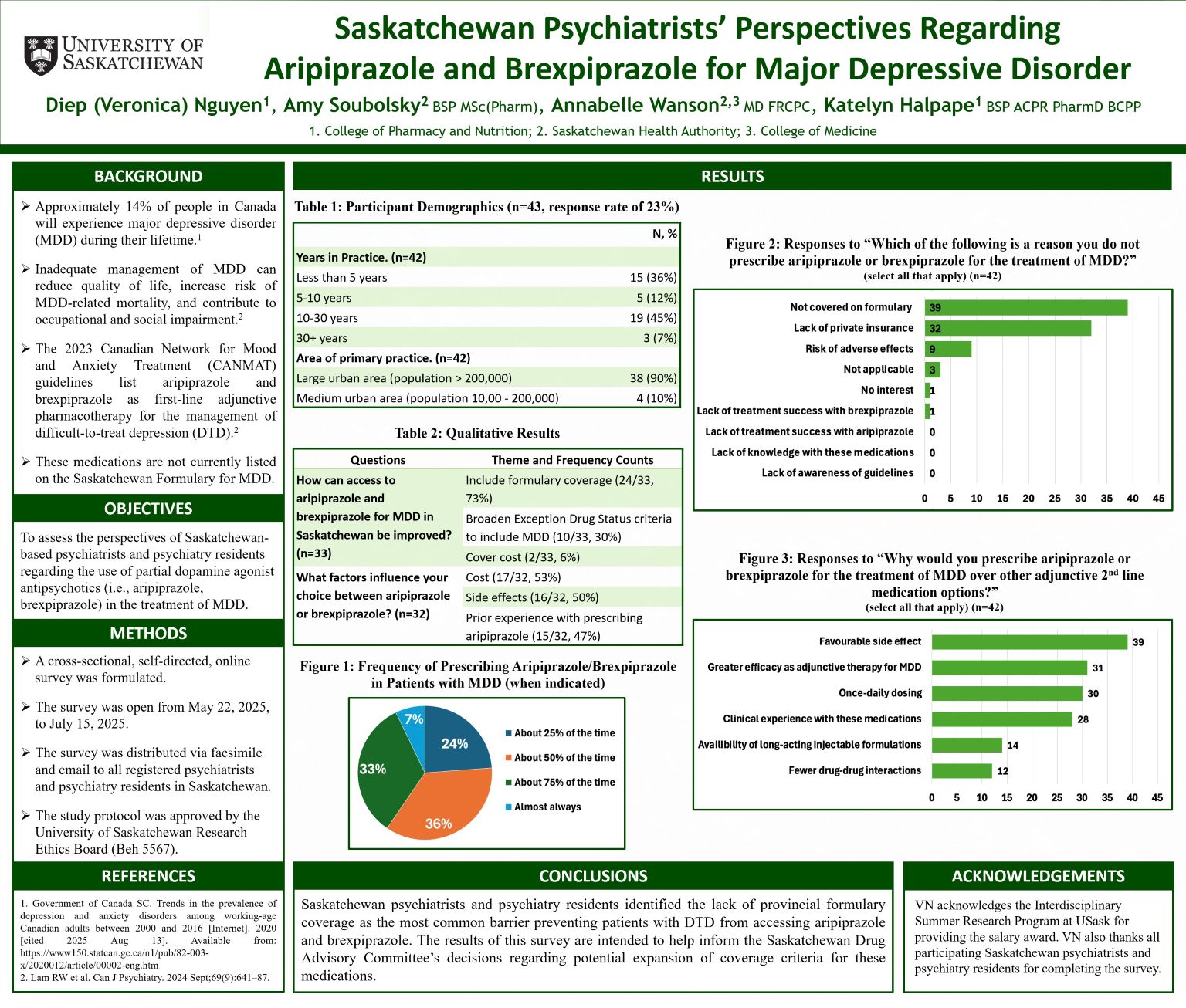 Conclusion: Saskatchewan psychiatrists understand the role of aripiprazole and brexpiprazole for MDD treatment; however, Saskatchewan residents are unable to access these medications due to formulary restrictions. These findings will support advocacy initiatives for provincial coverage.