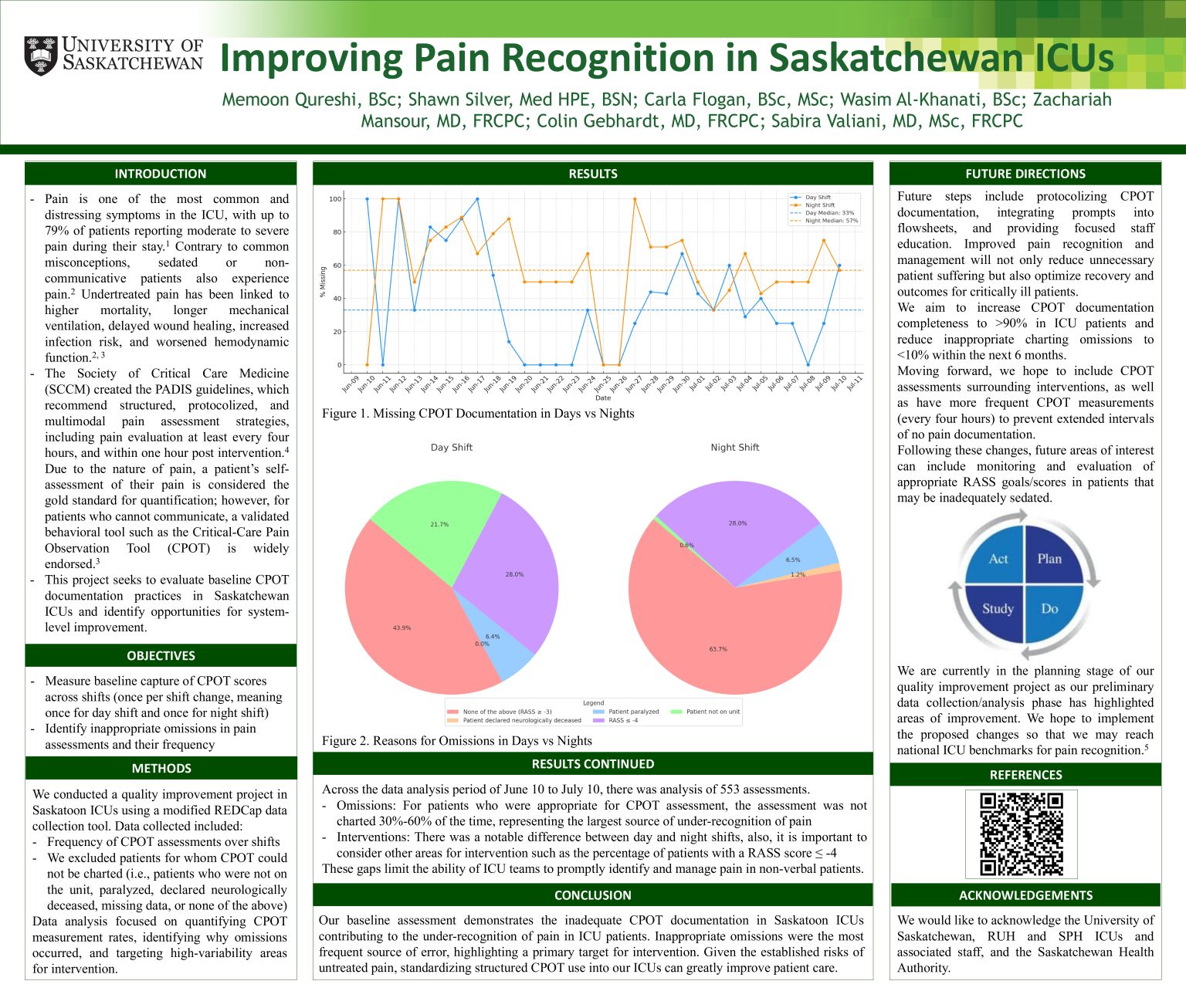 This quality improvement project evaluated baseline CPOT documentation practices in Saskatoon ICUs to identify opportunities for improvement. Using a modified REDCap tool, we collected data on the frequency of CPOT assessments, appropriateness of omissions, and variability across day and night shifts.