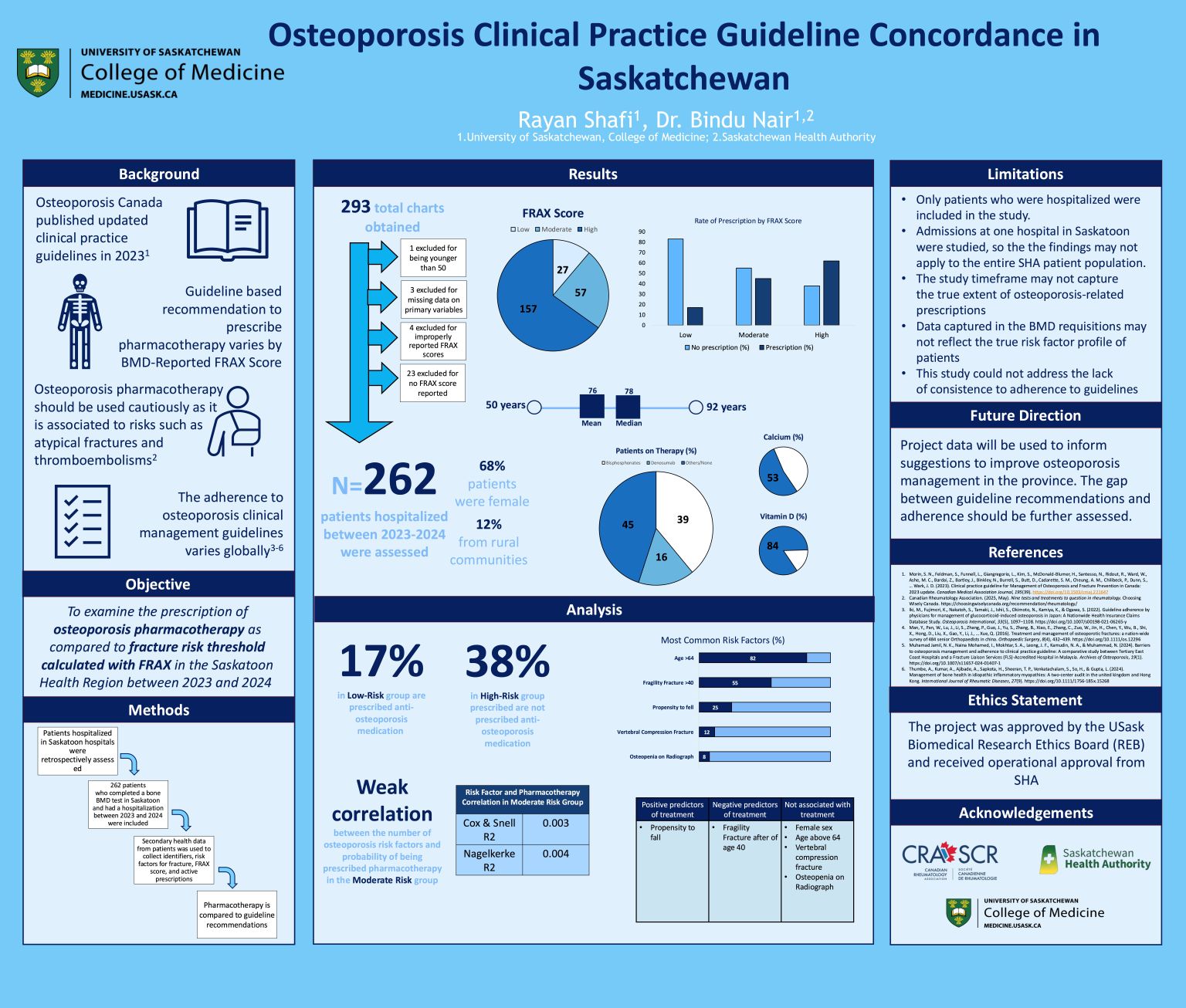 Methods: The subjects include patients who have completed a bone mineral density (BMD) test in Saskatoon and had a hospitalization between 2023 and 2024. 262 patient hospitalization charts and imaging reports were retrospectively analyzed to obtain data points on the patient identification, risk factors for osteoporotic fracture, FRAX score, and active prescriptions. Patient FRAX scores were compared to active prescriptions.