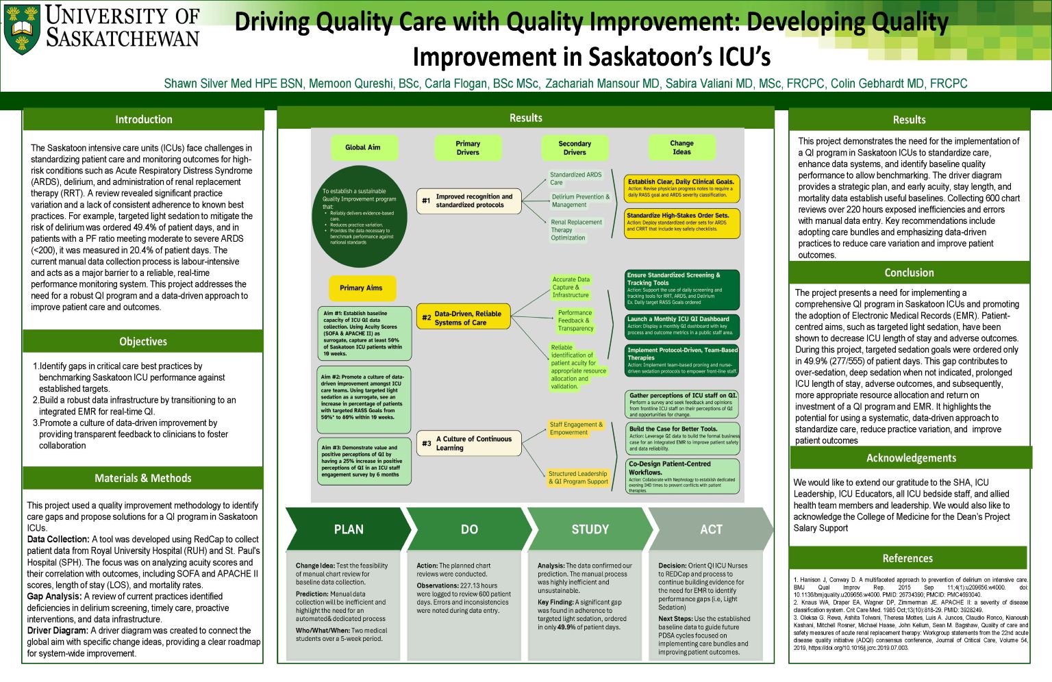 Results: This project demonstrates the need for a QI program in Saskatoon ICUs to standardize care, enhance data systems, and establish quality performance to facilitate benchmarking. The driver diagram provides a strategic plan, and early acuity, length of stay, and mortality data establish useful baselines. Collecting 600 chart reviews over 220 hours exposed inefficiencies and errors with manual data entry.