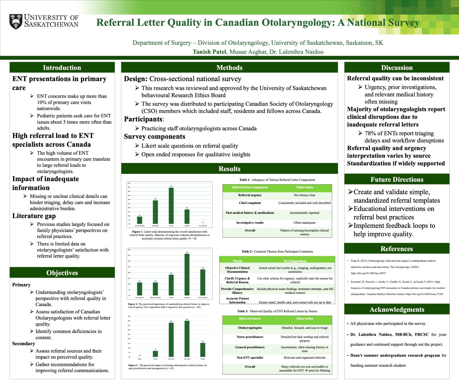 Objective: Accurate triaging and patient prioritization rely on “good” referral letters. However, quality varies widely across practice settings and providers. Despite high referral volumes, little is known about Canadian otolaryngologists’ satisfaction with the referral letters they receive. This study evaluated their satisfaction, regional and subspecialty differences, and opportunities for improvement.