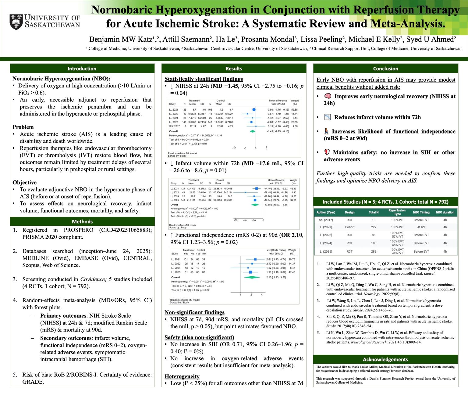 Results: NBO improved NIHSS at 24h (MD -1.45, 95% CI -2.75 to -0.16), reduced infarct