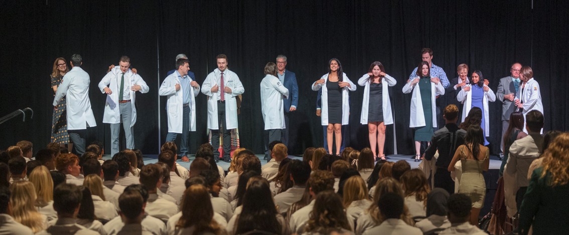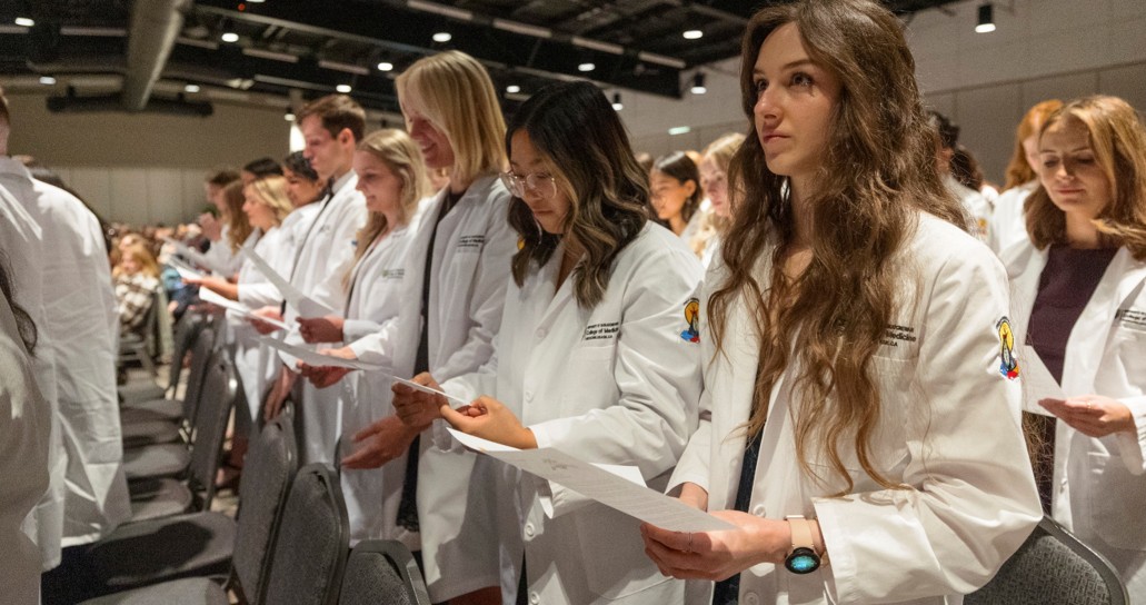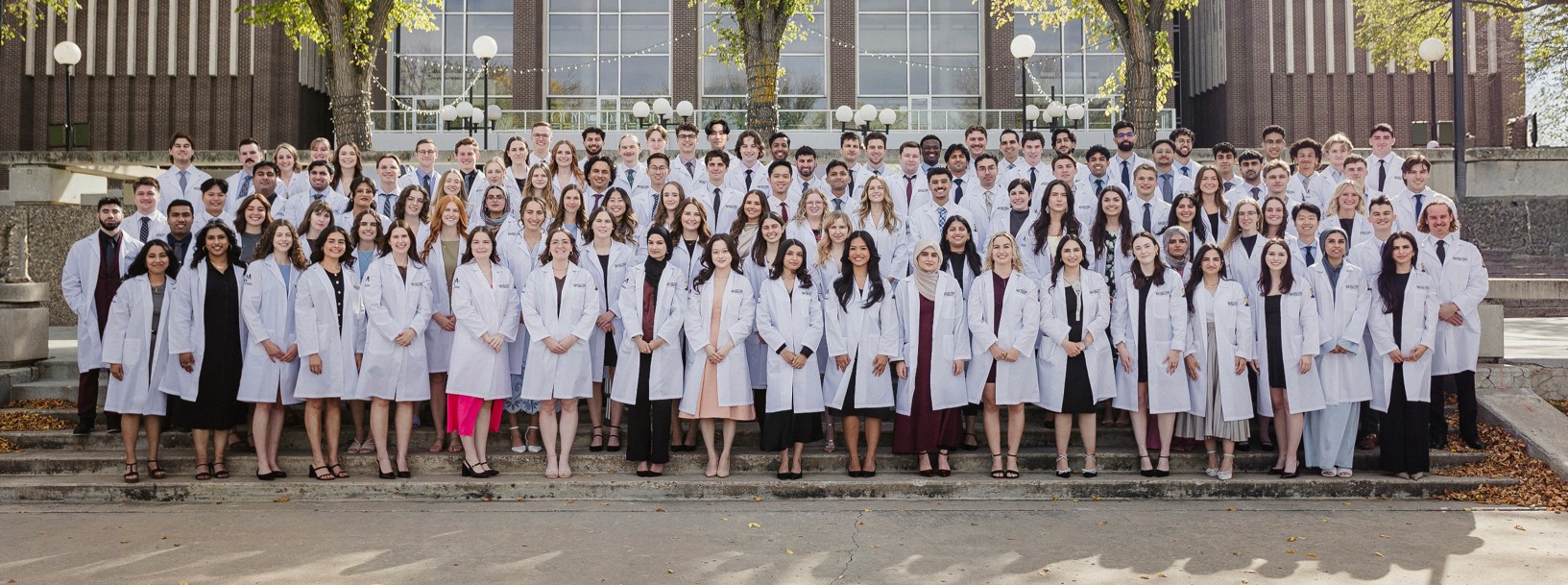 The White Coat Ceremony is a time-honoured tradition which celebrates the commencement of MD students' training to become physicians. The ceremony includes cloaking students into their first white coats, and reading the Oath of Commitment. Students attend from both the Regina and Saskatoon campuses.